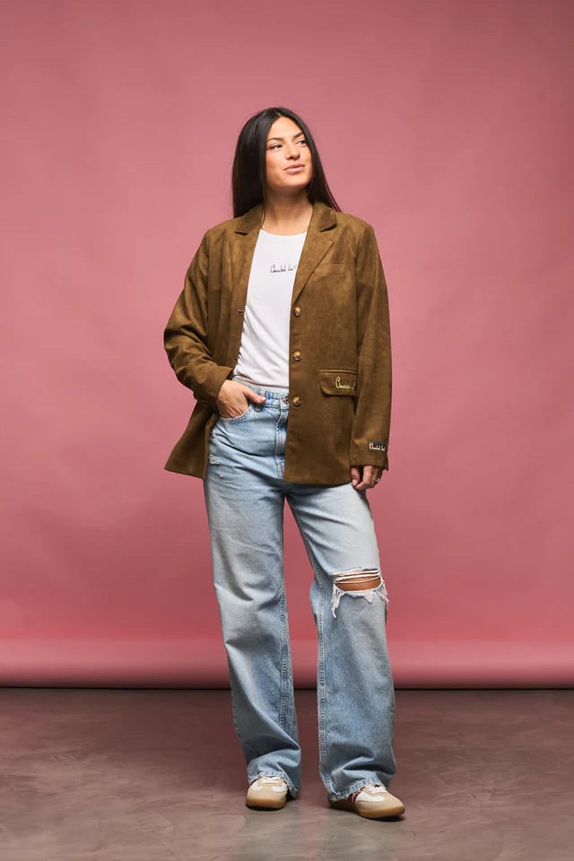 -Bolsillo decorativo de pañuelo y dos bolsillos de solapa con detalle de logo bordado en hilo beige.