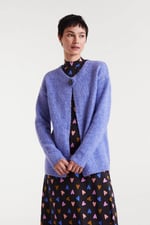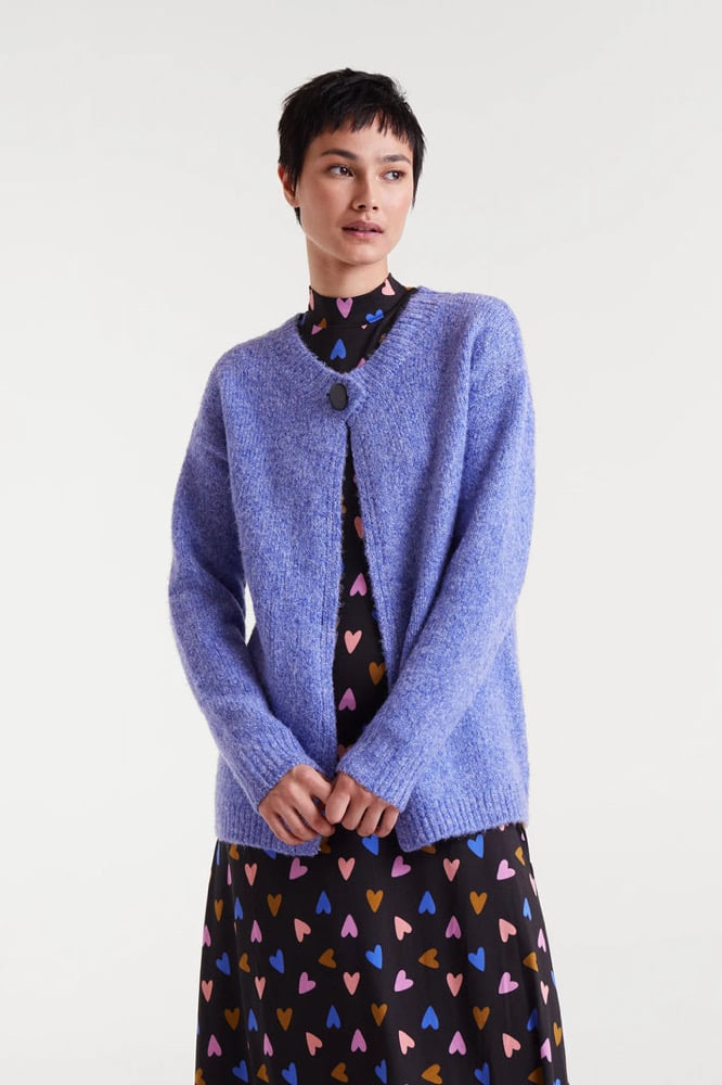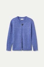 Cárdigan con tejido punto fino de color morado. Cuello redondo y manga larga. Hombro ligeramente caído. Cierre frontal con botón. Detalles en rib. La modelo mide 177 cm y lleva la talla S.