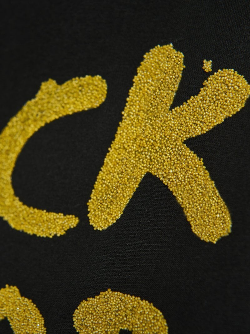 Camiseta básica de algodón relaxed fit con estampado e incrustaciones de bolitas tipo caviar en oro!