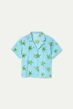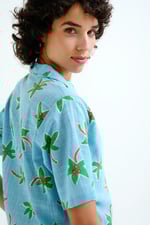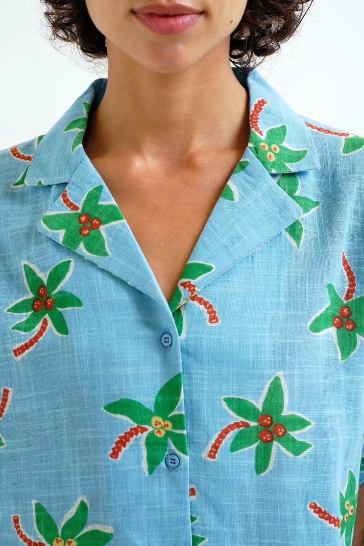Camisa de tejido 100% algodón con estampado cocotero small. Cuello solapa y manga corta. Cierre frontal con botones de color azul. La modelo mide 175 cm y lleva la talla S.