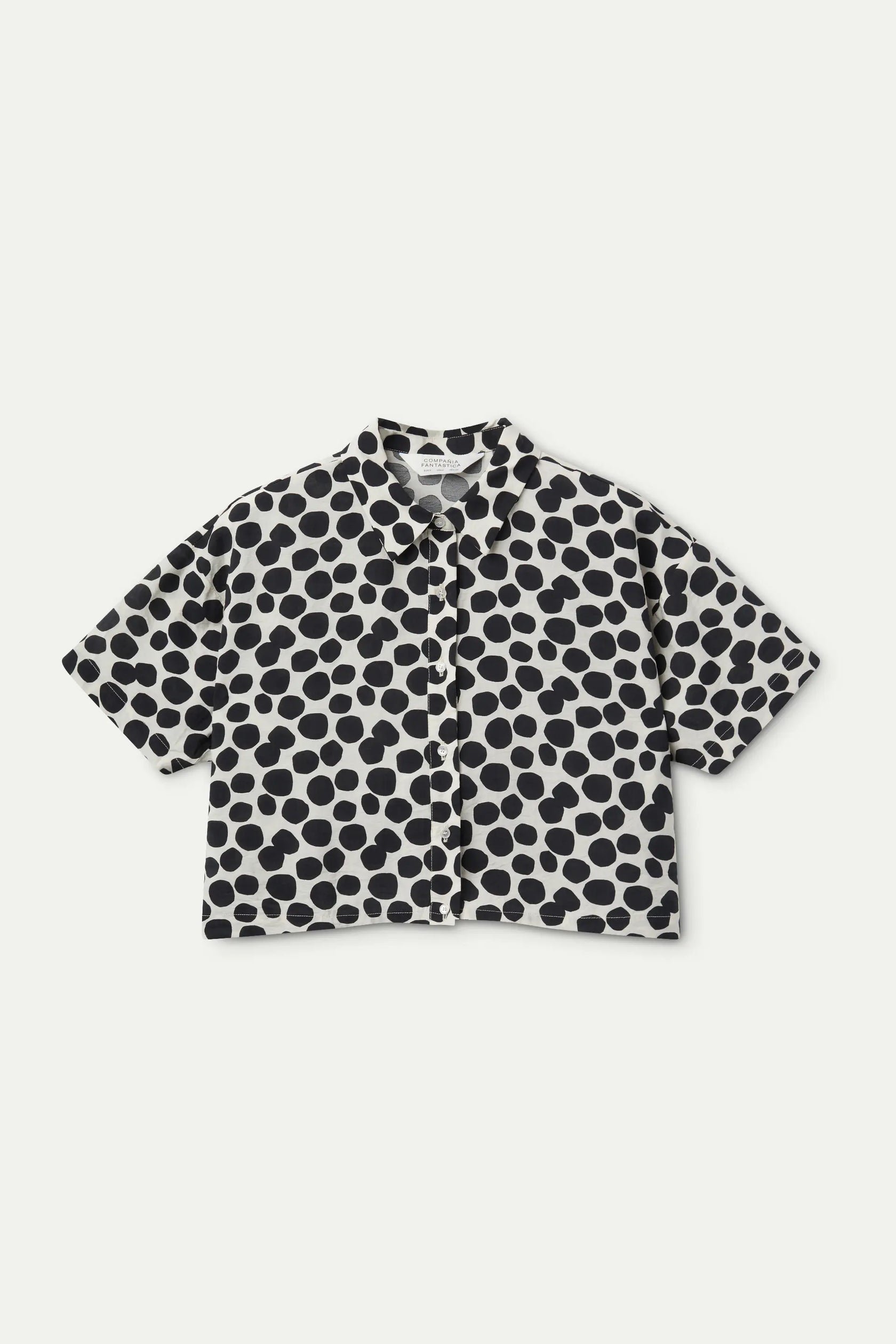 Camisa fluida en crepe ligero con estampado geométrico Terrazo. Con cuello solapa y manga corta. Cierre frontal con botones.