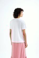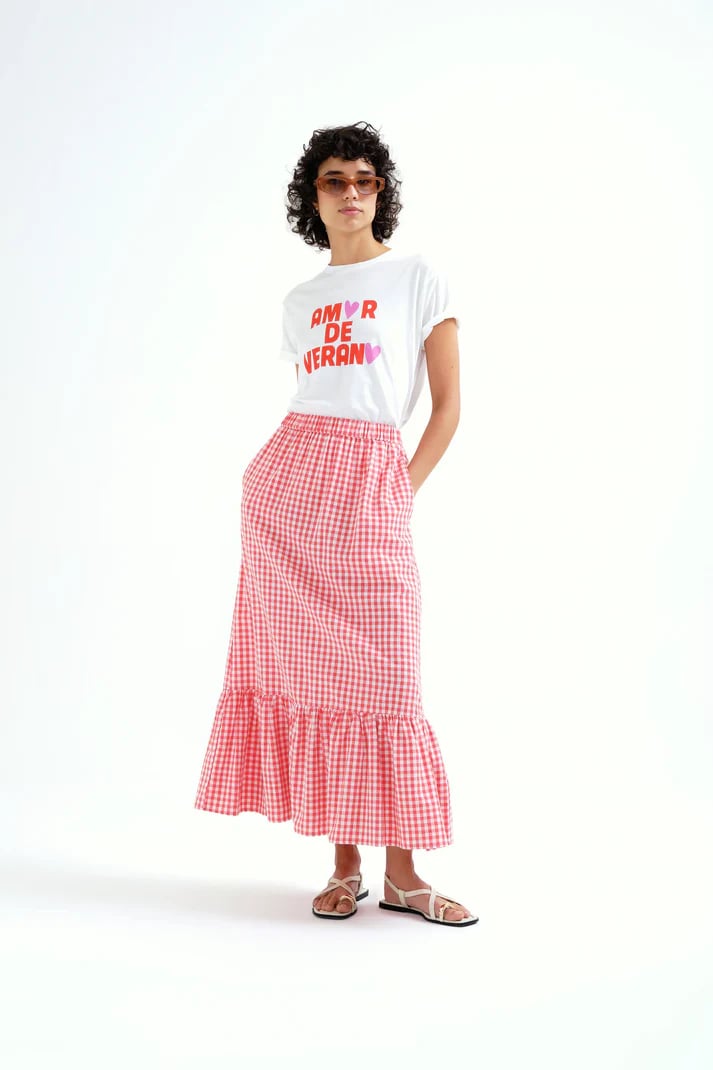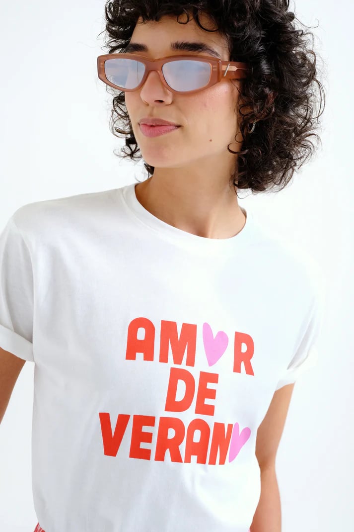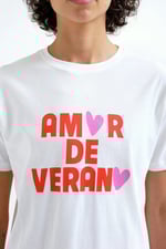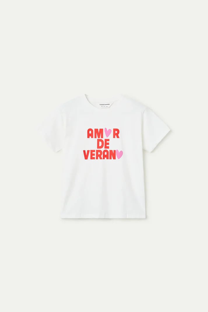 Camiseta de tejido 100% algodón con estampado "amor de verano". Cuello redondo y manga corta. La modelo mide 175 cm y lleva la talla S.