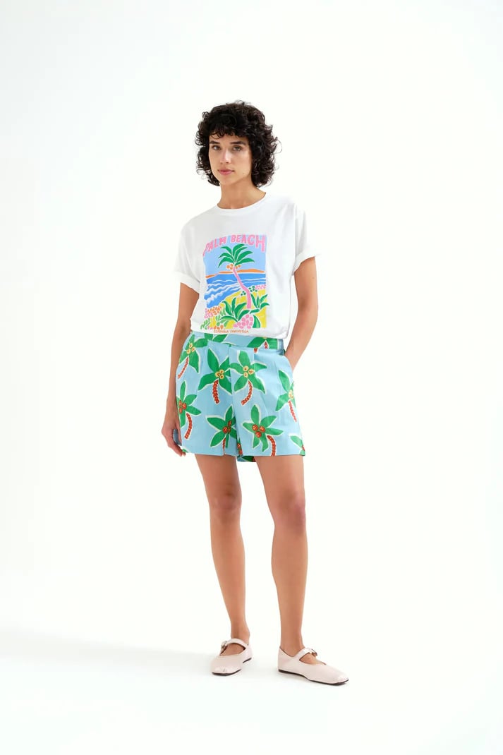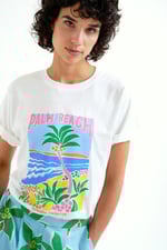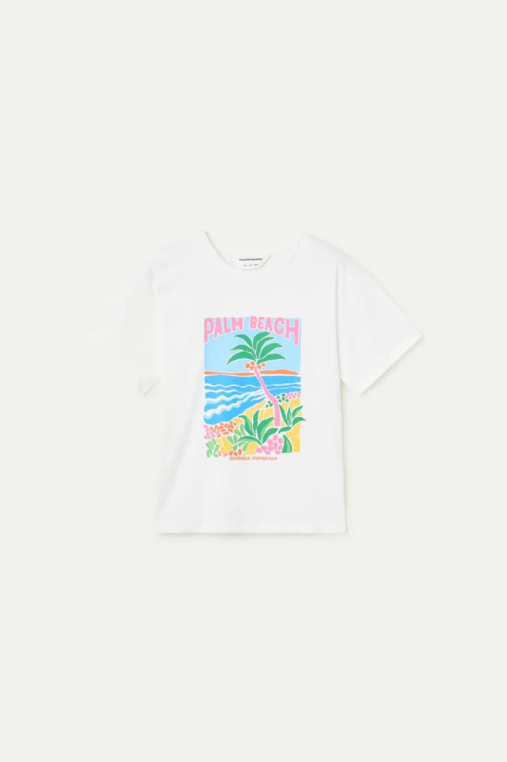 Camiseta de tejido 100% algodón con estampado palm beach con logo "Compañía Fantastica". Cuello redondo y manga corta. La modelo mide 175 cm y lleva la talla S.