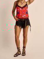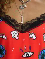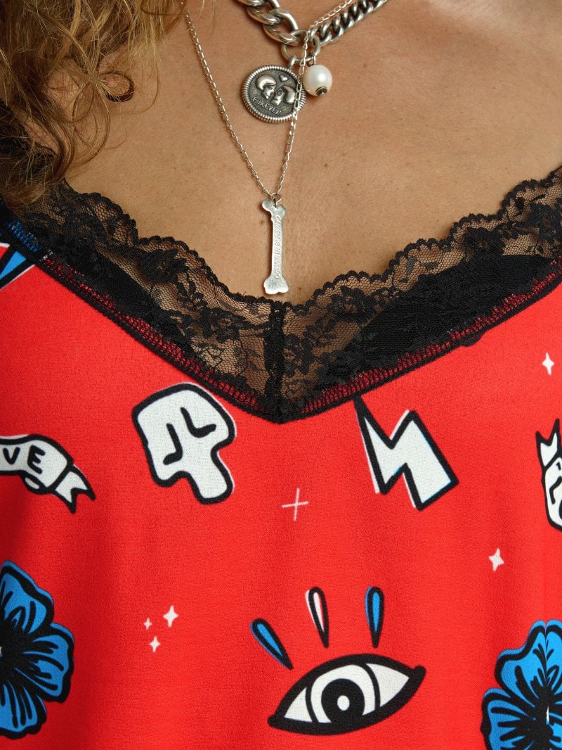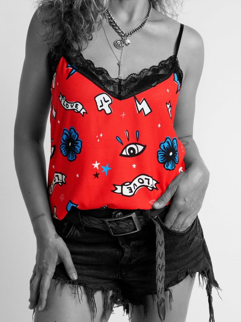 Camiseta de tirante (regulable) con detalle de encaje en pecho y estampado total print Rita. Es una camiseta muy especial con mucho rollazo!