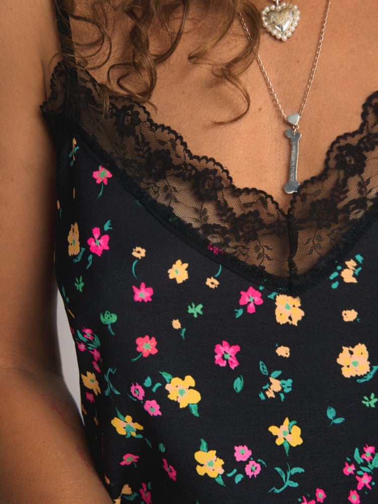 Camiseta de tirante (regulable) con detalle de encaje en pecho y estampado total print Eneanora. Es una camiseta muy especial con mucho rollazo!
