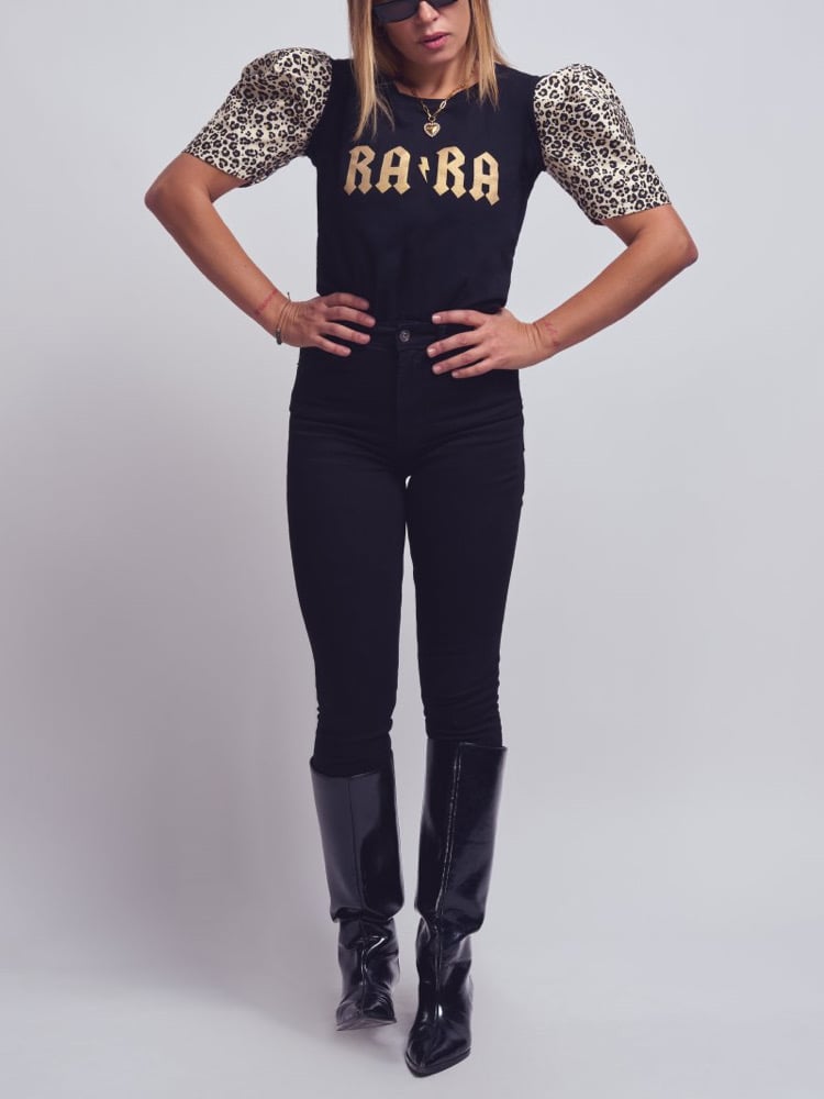 Camiseta negra con serigrafía en foil dorado y hombreras efecto volumen con estampado total print de leopardo y algodón rígido! Un must esta temporada!