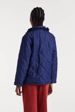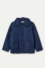 Chaqueta con tejido chambray 100% algodón de color azul. Cuello solapa con detalles de volantes. Manga larga y hombro ligeramente caído. Cierre frontal con botones. Bolsillos delanteros. Forro interior. La modelo mide 178 cm y lleva la talla S.