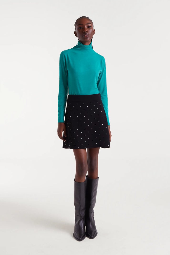 Falda corta punto jacquard con estampado mini black. Con cintura elástica y tiro medio. La modelo mide 178 cm y lleva la tasa S.