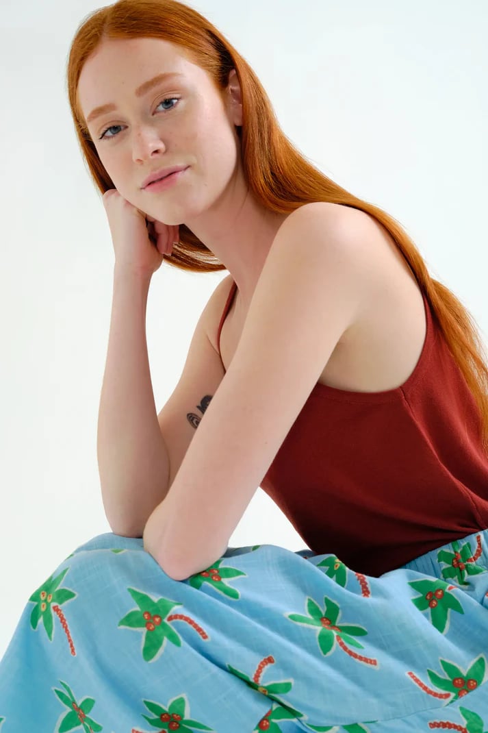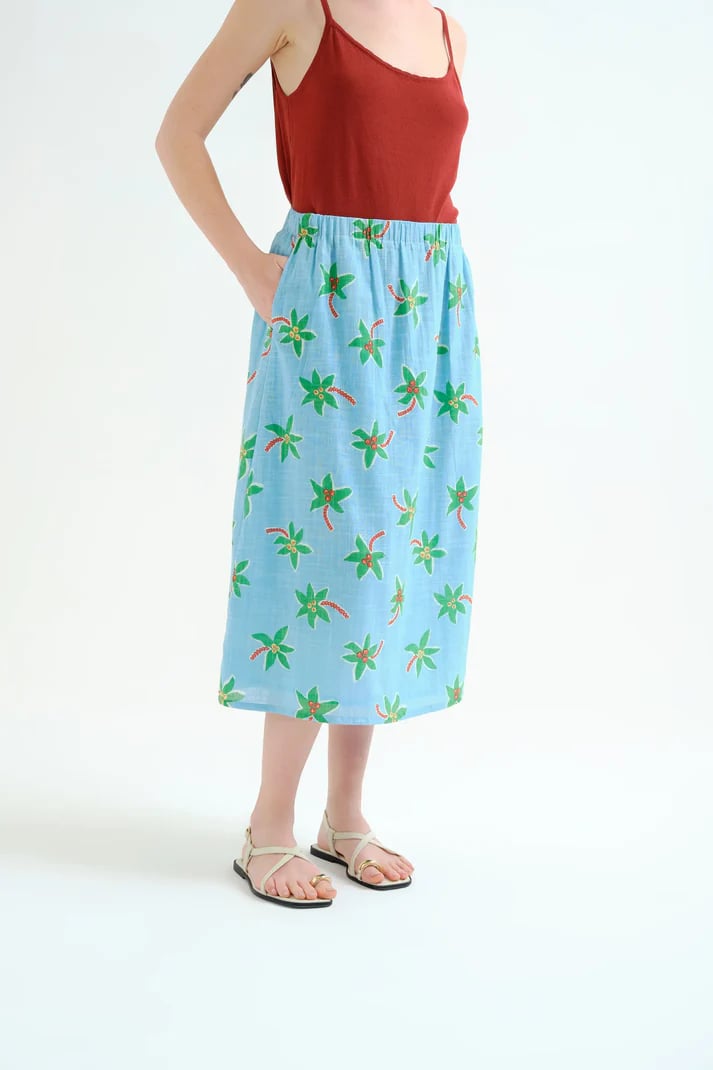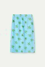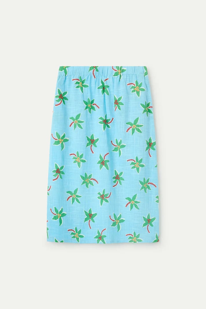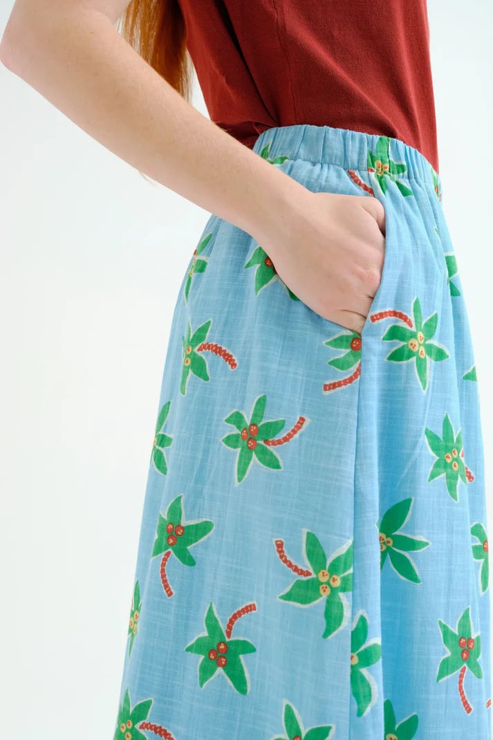 Falda midi de tejido 100% algodón con estampado cocotero Small. Cintura elástica de tiro medio. Corte amplio. Bolsillos laterales. Forro interior.La modelo mide 175 cm y lleva la talla S.