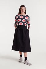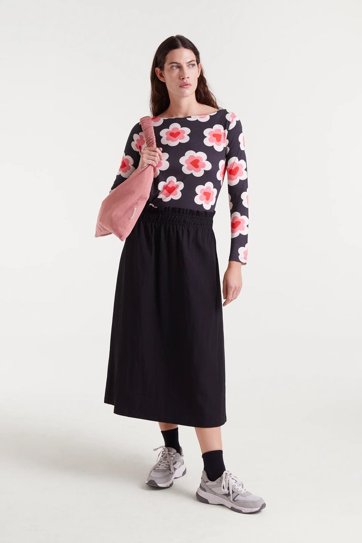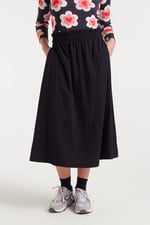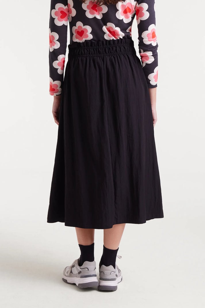 Falda midi con tejido technical de color negro. Cintura fija de tiro medio elástica con fruncido. Bolsillos laterales. La modelo mide 177 cm y lleva la talla S.