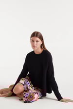 Jersey de punto con corte evasé de color negro. Con cuello redondo y manga larga. La modelo mide 177 cm y lleva la talla S.