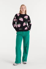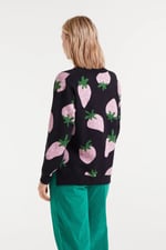 Jersey de punto jacquard con estampado Morango. Con cuello redondo y manga larga con hombro ligeramente caído. Detalles con acabados en rib. La modelo mide 174 cm y lleva la talla S.