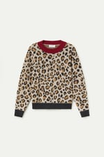 Jersey jacquard con estampado Mini Leopard. Con cuello redondo en color rojo y manga larga. Detalles en rib. La modelo mide 177 cm y lleva la talla S.