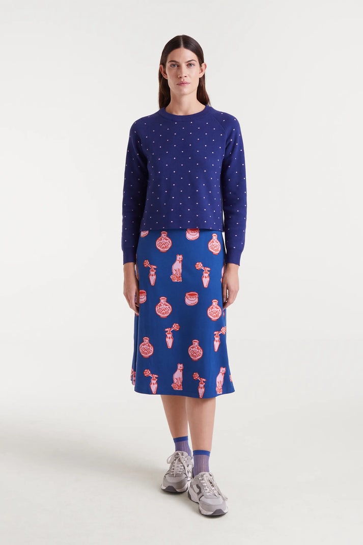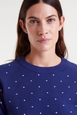 Jersey punto jacquard estampado topos mini de color navy blue y rosa. Cuello redondo y manga larga con detalles en rib. La modelo mide 177 cm y lleva la talla S.