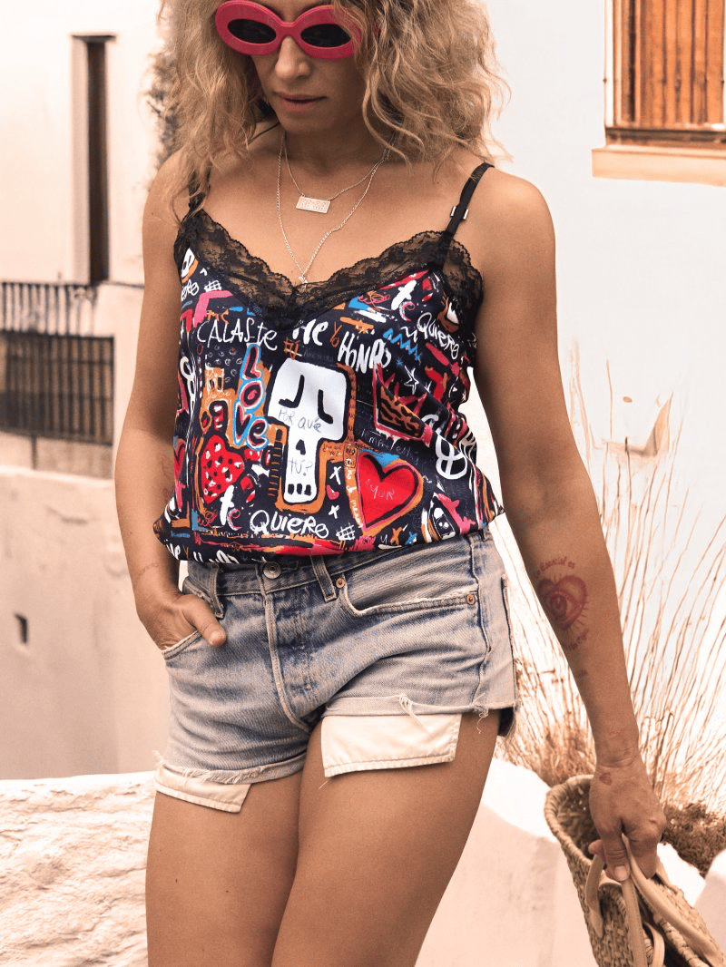 Camiseta de tirante (regulable) con detalle de encaje en pecho y estampado total print Love Pop. Es una camiseta muy especial con mucho rollazo!