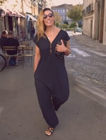 Mono negro y con ilustración roja efecto caviar, es multiposición puedes ponértelo hacia delante o detrás, estilo ali babá con maxivolumen en perneras.