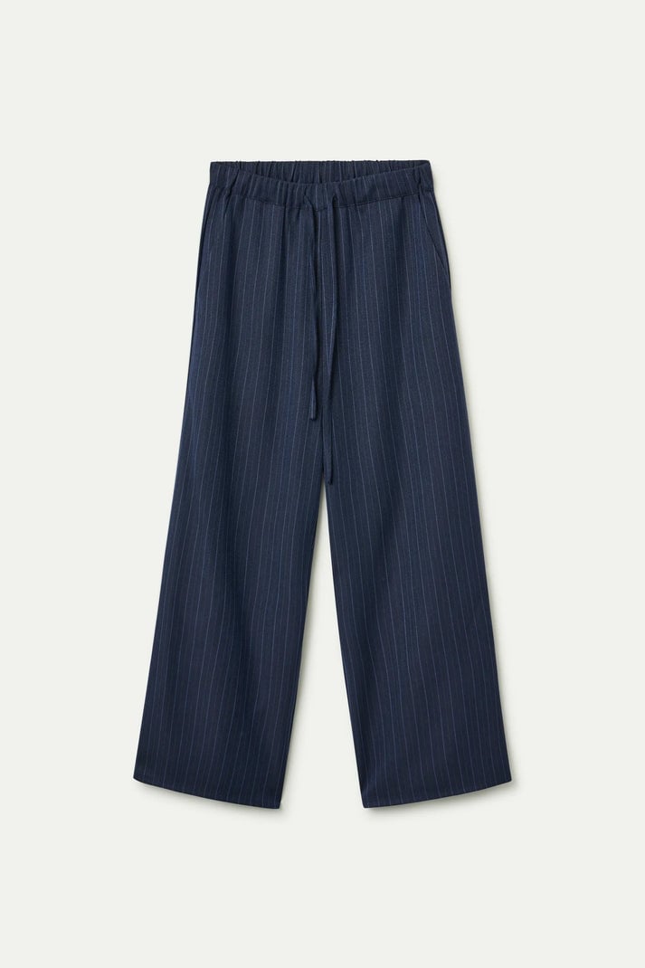 Pantalón de raya diplomática de color azul. Tiro medio y cintura elástica en la parte posterior. Pernera recta y cierre mediante cordón fino. La modelo mide 177 cm y lleva la talla S.