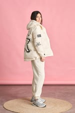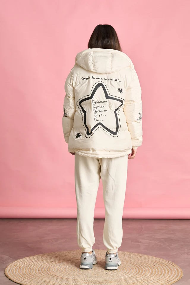 - Maxi print serigrafiado en espalda, con detalle de print sobre los codos y corazones en los puños.