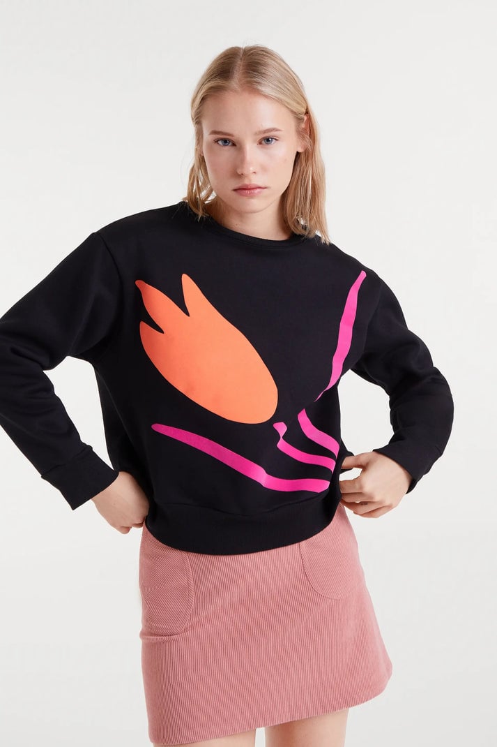 Sudadera con print de flor. Con cuello redondo y manga larga. Detalle de acabados en rib. La modelo mide 179 cm y lleva la talla S.