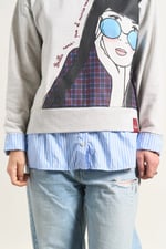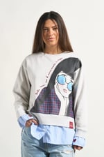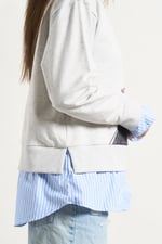 -Bajo de camisa popelín interior adherida en el cuerpo de la sudadera, con largos desiguales.
