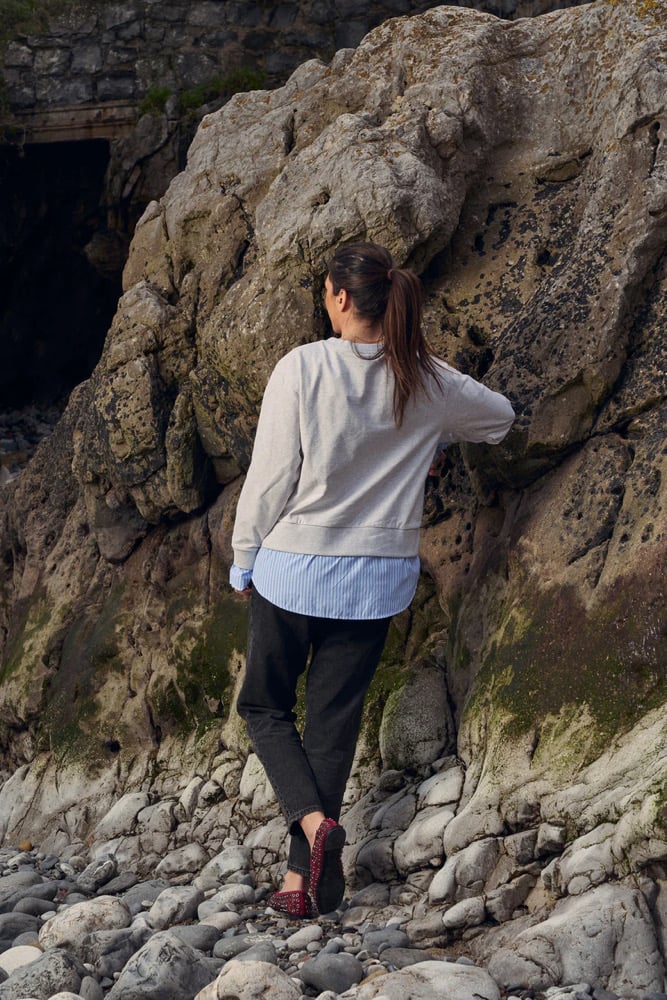 -Puño de camisa popelín interior adherida a la sudadera, con detalle de corazones bordados.
