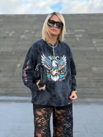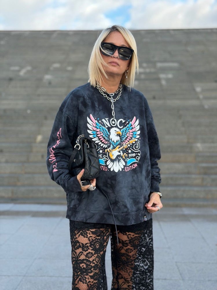 Eagle Rock, la fuerza de águila y ese toque rock. Unisex, cañera….Sudadeta over en felpa tie dye con pelito interior, súper gustosa, ilustración central de águila con ese rollo tan Top. Llévala sola o en pareja, con amigas, a un concierto….no querrás quitártela de encima porque literalmente va con todo!!