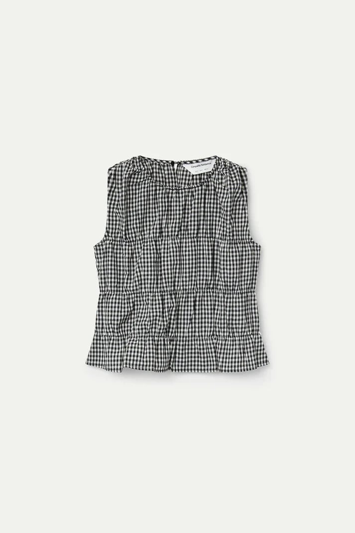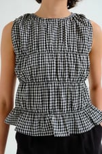Top de tejido 80% algodón vichy de color negro. Cuello redondo y sin mangas. Detalles elásticos y con volantes. La modelo mide 175 cm y lleva la talla S.