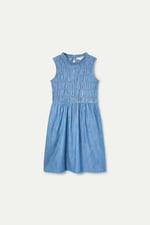 Vestido corto con tejido 100% algodón chambray de color azul claro. Cuello redondo y sin mangas. Cierre posterior con botón oculto.Bolsillos laterales.Detalle elástico de color rojo. La modelo mide 175 cm y lleva la talla S.