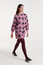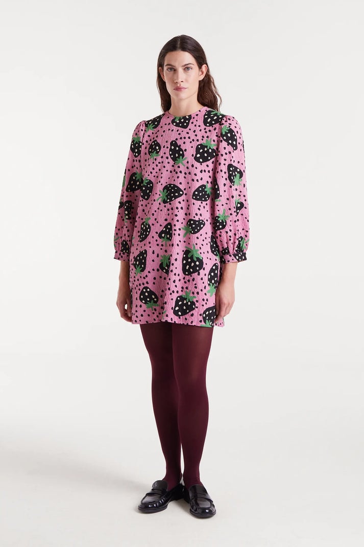 Vestido corto de tejido ligero y arrugado con estampado Morango Big. Cuello redondo y manga larga abullonada. Forro interior. Bolsillos laterales. La modelo mide 177 cm y lleva la talla S.