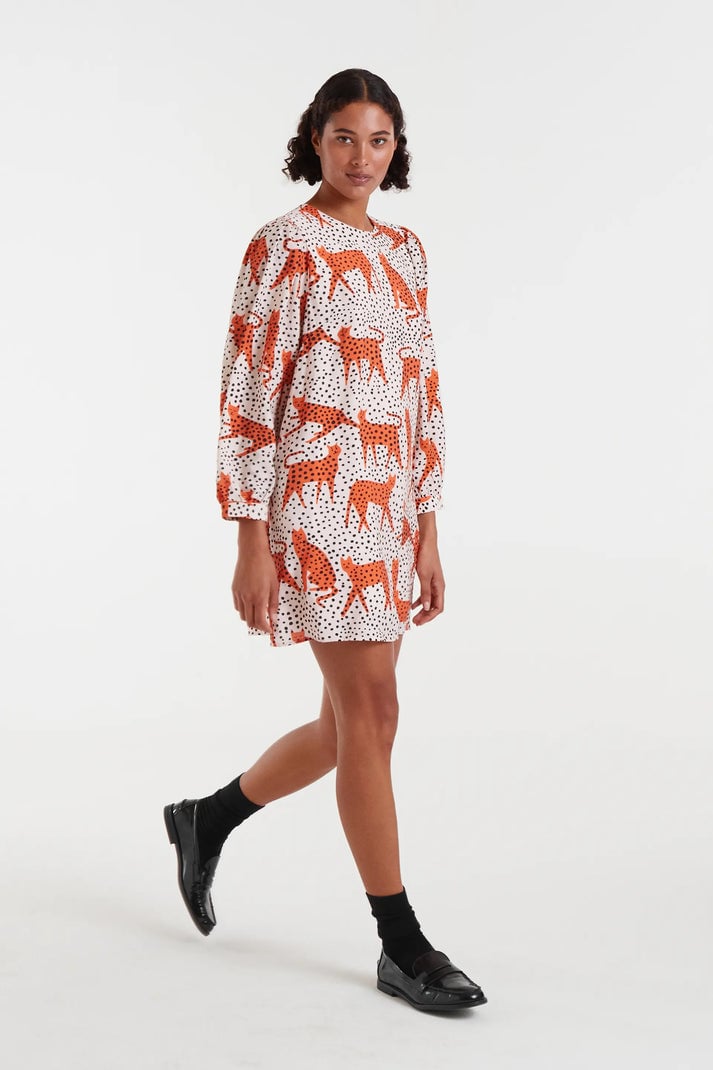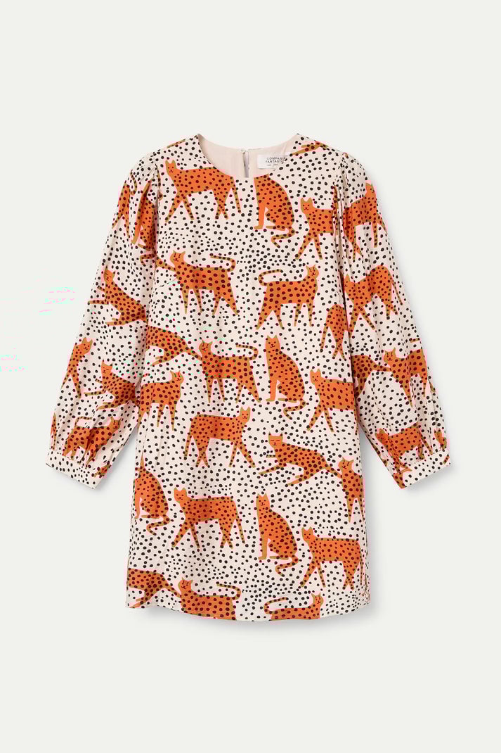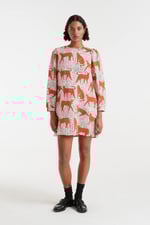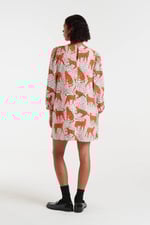 Vestido corto de tejido crepé ligero con estampado Tano. Con cuello redondo y manga larga terminada en puño con botón. Cierre trasero con abertura y botón. Forro interior.La modelo mide 175 cm y lleva la talla S.