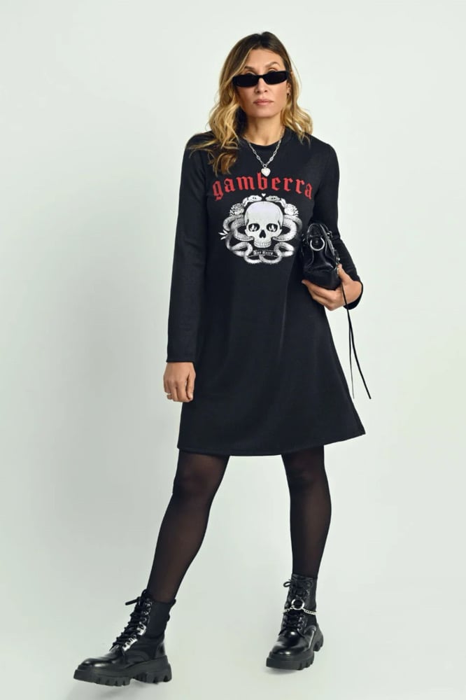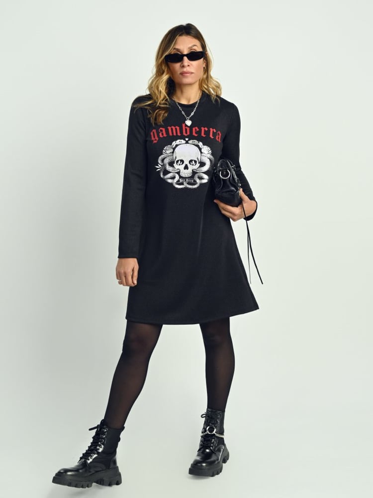 Vestido negro lurex con brillitos e ilustración en foil plata. Para que brilles este invierno como nunca!