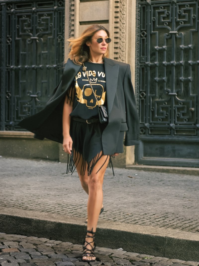 Vestido de algodón con flequitos y diseño en el frente en foil dorado.