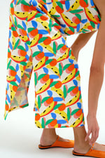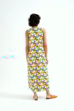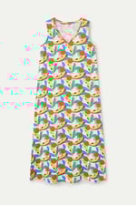 Vestido largo de tejido 100% algodón con estampado tutti frutti small. Cuello pico y sin mangas. Abertura lateral. La modelo mide 175 cm y lleva la talla S.