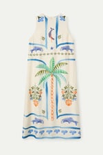 Vestido largo de tejido de crepé con estampado palm & mermaid. Cuello redondo y sin mangas. Corte fluído.Forro interior. La modelo mide 175 cm y lleva la talla S.
