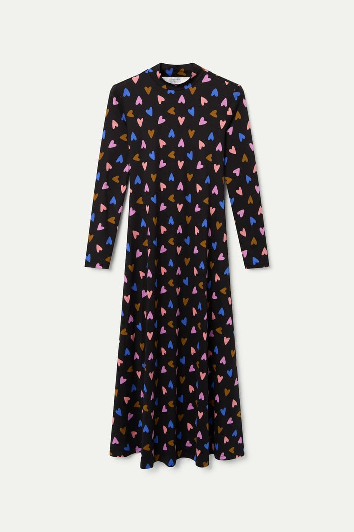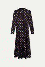 Vestido largo con tejido punto estampado Potpourri. Con cuello mock y manga larga. Ligera abertura lateral. La modelo mide 175 cm y lleva la talla S.