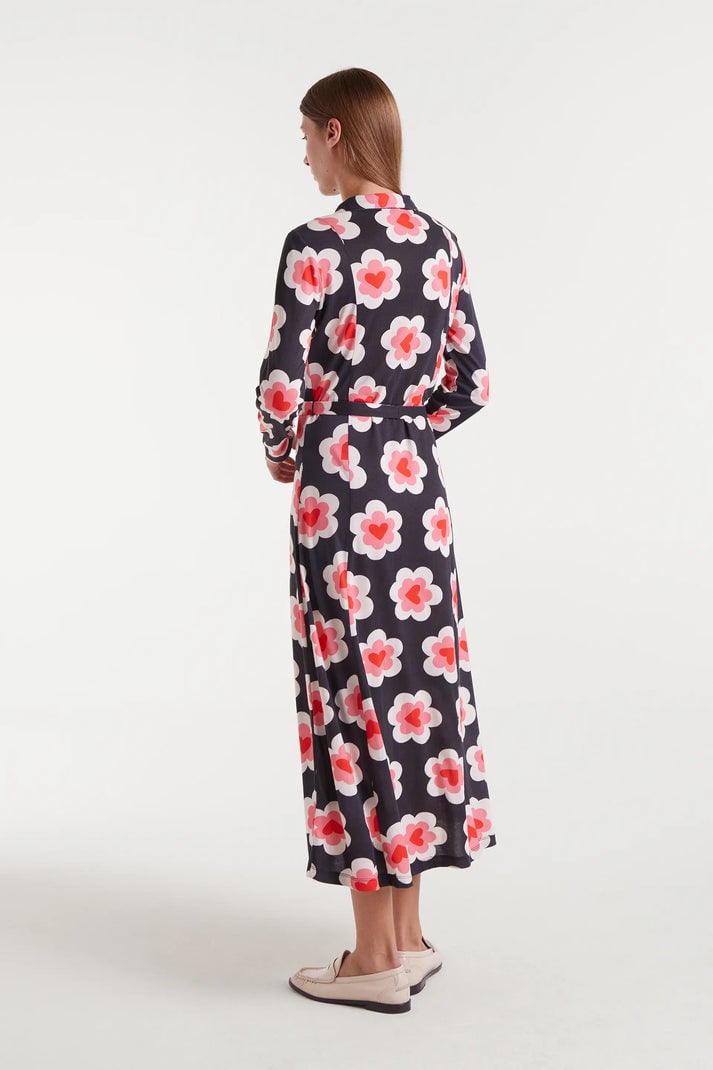 Vestido largo con estampado Sweetheart. Cuello con solapa y manga larga. Cierre frontal con botones y cintura lazada. La modelo mide 177 cm y lleva la talla S.