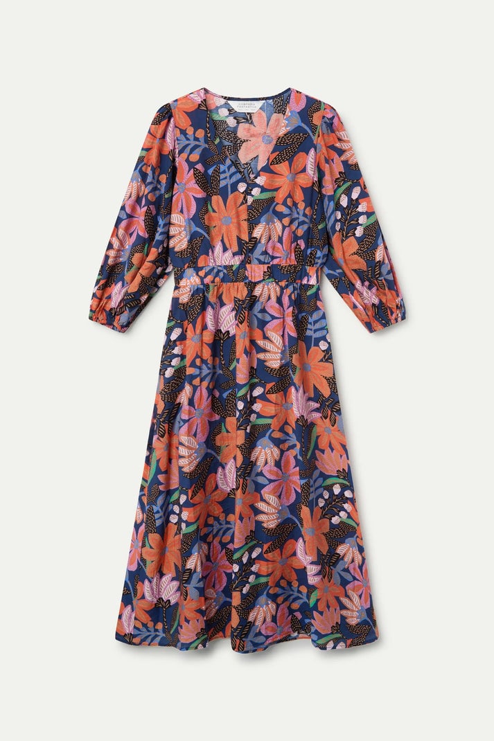 Vestido largo de tejido crepé ligero con estampado Tigerlily. Con cuello escote pico y manga francesa con abertura elástica. Bolsillos laterales. La modelo mide 177 cm y lleva la talla S.