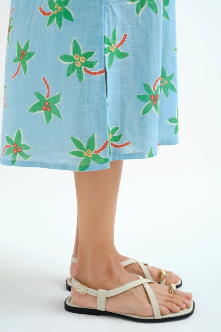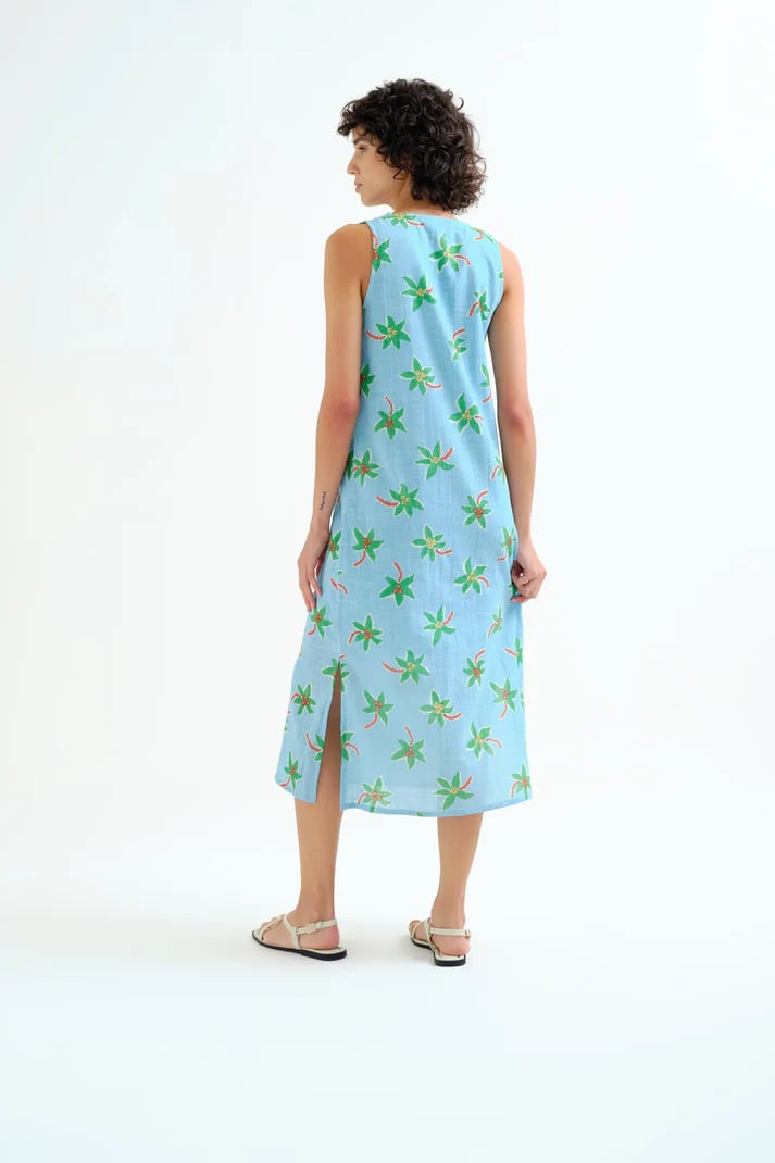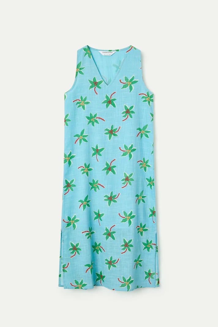 Vestido midi de tejido 100% algodón con estampado cocotero small. Escote pico y sin mangas. Ligera abertura lateral. Corte fluído. Forro interior.La modelo mide 175 cm y lleva la talla S.